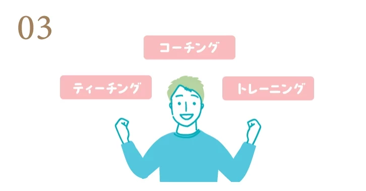 目標と現在の課題に沿った『コーチング』、英語の質問に対する分かりやすい『ティーチング』、そしてその場で一緒に練習し習得を促す『トレーニング』を組み合わせ、英語力を効果的に伸ばします。
